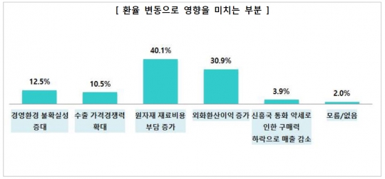 기업들은 환율 상승이 오히려 비용만 높여 수출에 악영향을 끼친다고 생각했다. 최근 환율 변동으로 기업에 가장 큰 영향을 미치는 부분을 물어보는 문항에 '원자재 재료비용 부담 증가'라는 응답이 40.1%로 가장 높았다. 이어진 응답은 '외화환산이익 증가'(30.9%), '경영환경 불확실성 증대'(12.5%), '수출 가격경쟁력 확대'(10.5%) 순으로 나타났다.