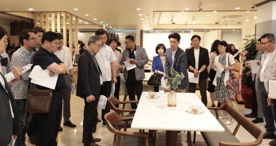 3일 인천 남동공단에 위치한 에몬스가구 본사에서 진행한 '2019년 가을시즌 가구 트랜드 및 신제품 품평회'에서 대리점주들이 가구를 살펴보고 있다. /에몬스