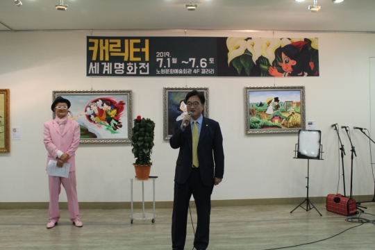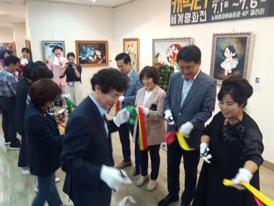 캐릭터명화전 테이프커팅을 하고 있는 오른쪽 앞 이소영대표, 오승록노원구청장,봉양순시의원, 손영준구의원, 좌측앞 노원문화재단김승국이사장,채유미시의원,김선희구의원,이영규구의원/사진 김현채