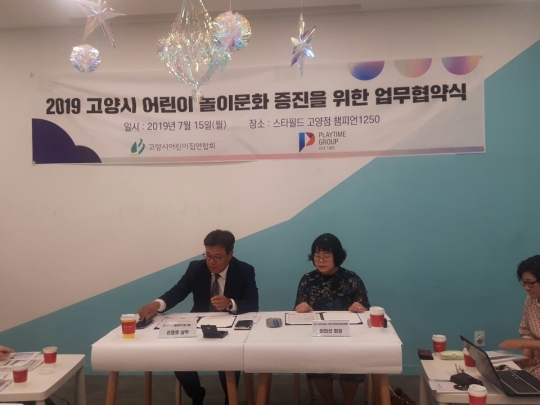 이의선 고양시어린이집연합회장과 플레이타임그룹 권영호 상무가 업무협약서에 서명을 하고 있다. /사진 김현채