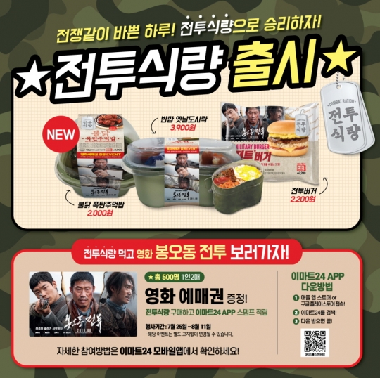 이마트24는 광복절을 앞두고 영화 '봉오동전투'와 협업해 프레시 푸드 3종 '반합옛날도시락', '불닭폭탄주먹밥', '전투버거'를 출시했다.