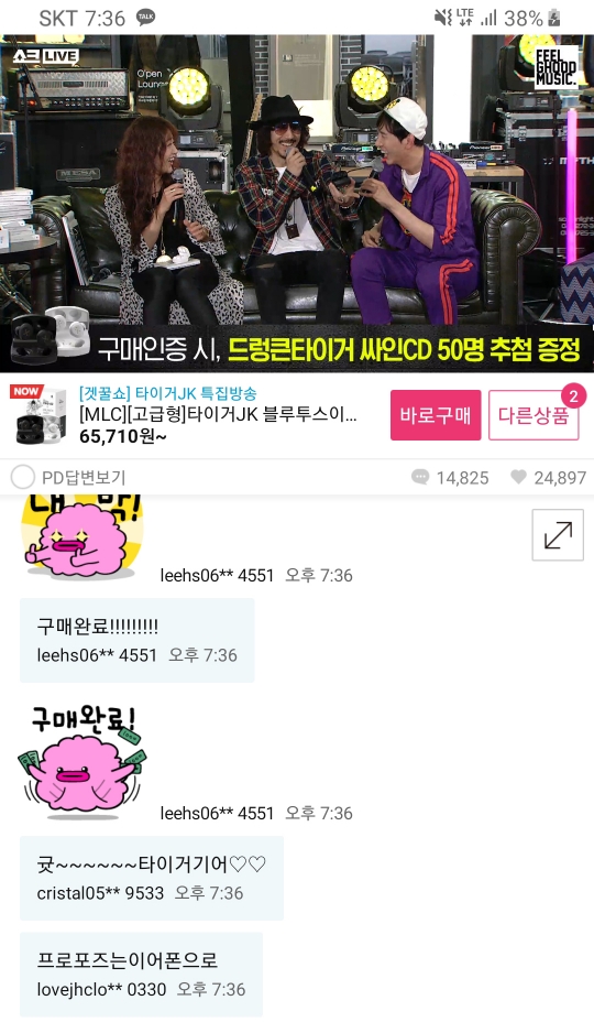 "이어폰을 끼면 타이거JK 씨의 목소리로 음성안내가 나온다는 거죠? 굉장하네요. 채팅창에 '당장 구매해야겠다'는 분도 계시고, 지금 '좋아요' 수가 폭발하고 있습니다. 이쯤에서 타이거JK 씨의 공연을 보고 올까요?" (쇼호스트)