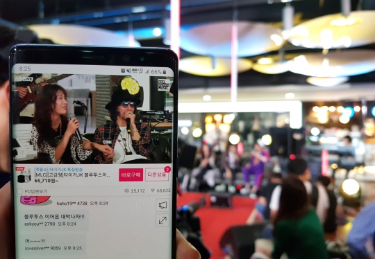 쇼크라이브 타이거JK 쇼케이스 현장에서 모바일로 송출되는 생방송 화면/CJ ENM 오쇼핑부문
