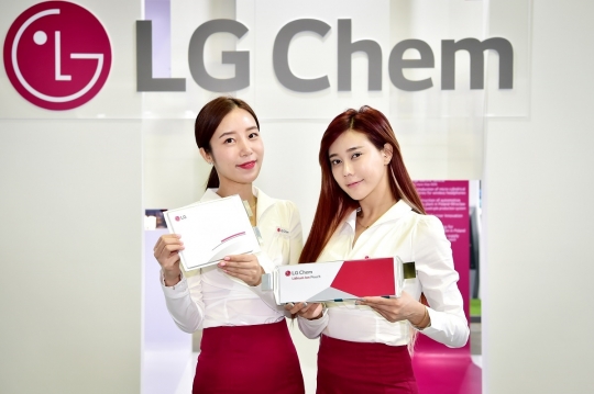16일 서울 강남구 코엑스에서 열린 '인터배터리 2019'의 LG화학 부스에서 모델들이 플러그인 하이브리드 전기차(PHEV)용 파우치 배터리(왼쪽 제품)와 순수 전기차용 파우치 배터리를 소개하고 있다.