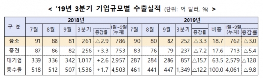 중소기업의 3분기 수출이 전년 동기 대비 3.3% 감소했지만, 감소폭이 전체 수출 및 대기업 수출에 비해 크지 않았다. 이는 미·중 무역 분쟁과 중화권 경제 불황 등 대외여건의 불확실성에도 중소기업 수출 실적이 방어를 잘했음을 보여준다. 올해 3분기 총수출은 1349억 달러로 전년 동기 대비 12.2% 감소했다. 대기업의 수출은 2018년 3분기보다 15.7% 줄어든 857억달러, 중견기업의 수출은 7.2% 감소한 237달러였다. 중소기업의 수출 비중도 전년 동기 대비 1.7%포인트 증가한 18.7%를 기록했다.