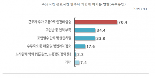 준비가 안된 상태에서 근로시간을 줄일 경우 70.4%가 '근로자 추가 고용으로 인한 인건비 상승'을 가장 우려했다. '구인난 등 인력 부족'(34.4%)과 '조업일수 단축 및 생산차질'(33.8%) 등도 걱정이었다.