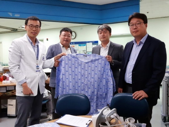 대한비만대사외과학회 위원들과 김동욱 교수(맨왼쪽)가 비만환자를 위한 환자복을 들고 있다./사진 단국대병원