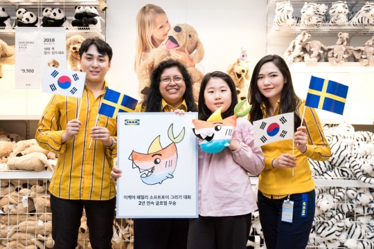 이케아 '소프트토이 그리기 대회' 글로벌 최종 우승자가 기념촬영을 하고있다./이케아코리아