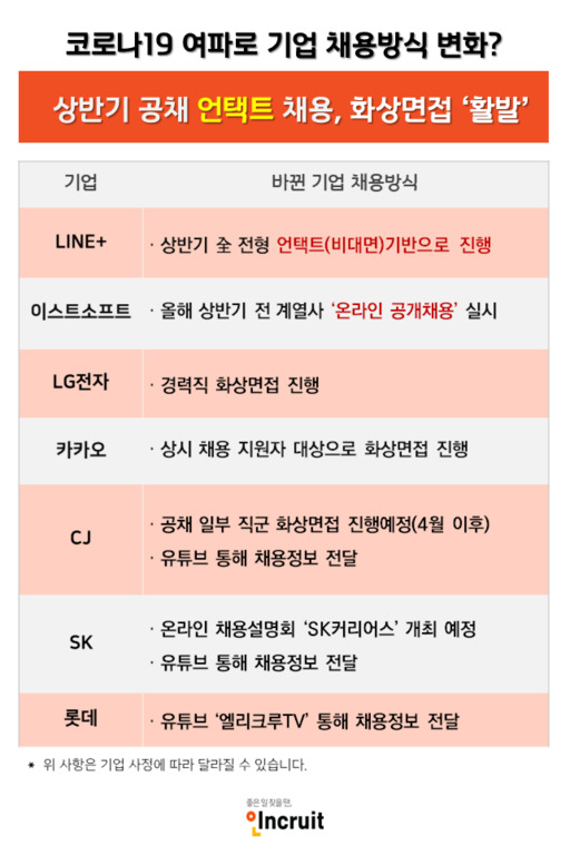 11일 인크루트에 따르면, 라인플러스(LINE+), 이스트소프트는 올해 상반기 전체 전형에서 비대면 기반 채용을 진행키로 했고, LG전자, 카카오, CJ, SK, 롯데 등은 일부 채용에서 화상면접을 진행하거나 유튜브 등 온라인을 통한 채용설명회를 개최할 예정이다.