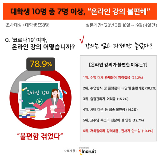 특히 앞선 이유보다 가장 많이 꼽힌 불편함 1위는 '과제물 대체가 많아졌음'(24.2%)으로 나타났다. 일반 대학의 온라인 강의가 전면 시행되는게 전례가 없었고, 학교 측도 강의 제작과 준비에 일정이 넉넉했을 리 없다. 개강과 동시에 '과제 대체'와 '리포트 대체' 문구를 확인한 대학생들의 허탈감이 큰 것으로 파악된다.