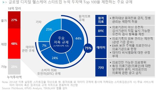 또 글로벌 디지털 헬스케어 스타트업 상위 100대 기업 중 63개사가 국내 규제로 인해 한국에서의 사업이 제한되는 것으로 조사됐다.
