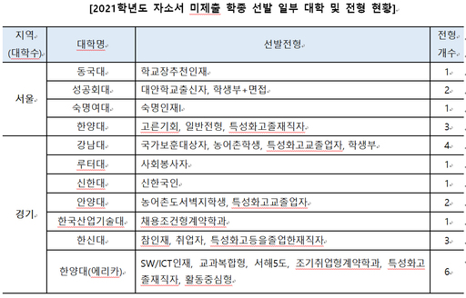 서울 소재 대학의 경우 자소서 미제출 학종전형을 치르는 곳은 동국대(학교장추천인재전형), 성공회대(대안학교출신자전형 등), 숙명여대(숙명인재1), 한양대(고른기회전형 등) 등이고, 경기지역에서는 강남대(국가보훈대상자전형 등), 루터대(사회봉사자전형), 신한대(신한국인전형), 안양대(농어촌도서벽지학생전형), 한국산업기술대(채용조건형계약학과), 한신대(참인재전형 등), 한양대에리카(SW/ICT인재전형 등) 등이다.