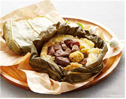 '오리연잎밥'은 오리고기를 작게 썰어 양념장과 함께 볶은 후 미리 멥쌀과 찹쌀, 밥, 은행, 소금을 넣어 지은 밥을 연잎으로 싼 후 20분 정도 쪄낸다.
