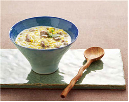 '오리고기녹두수프'는 냄비에 버터를 넣고 다진 양파와 물에 불려 씻은 녹두, 오리가슴살을 넣고 볶는다. 고기가 익으면 물을 넣고 녹두가 익을 때까지 끊인 후 생크림, 소금 등을 넣고 한소끔 더 끓여낸다.