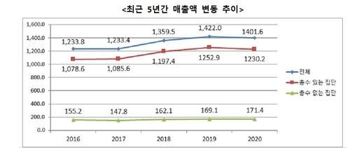매출이 가장 큰 폭으로 증가한 기업집단은 현대자동차(▲11조5000억원), 효성(▲4조원), 넷마블(▲2조8000억원)로 나타났다. 현대자동차는 완성차 판매 호조와 원화 약세에 따른 환차익 등이 영향을 끼쳤고, 효성은 분할에 따른 회계상 매출 감소 요인 해소, 넷마블은 코웨이 인수로 각각 매출을 높였다는 게 공정위의 분석이다.