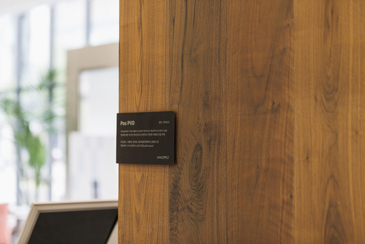 더샵갤러리는 1층부터 3층까지 포스코 강건재를 대거 적용했다. 일부 내부 벽체는 철강에 잉크젯프린트로 나무 모양을 인쇄한 '포스아트' 외벽이 적용돼 진짜 나무를 만지는 듯한 느낌을 준다. 하지만 나무와 대리석으로 보이는 내장재는 철강재로 만들어 자석을 붙일 수 있다.