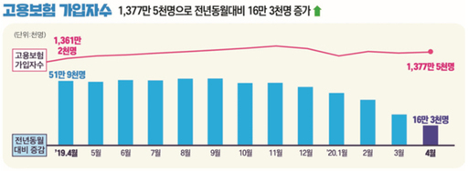 신종 코로나바이러스 감염증(코로나19) 사태로 실업자가 늘면서 지난 4월 무려 1조원의 실업급여가 지급됐다. 구직급여 신규신청자는 12만9000명, 수혜자는 65만1000명에 달했다. 코로나19 상황에 따라 올해 총 지급 규모가 12조원을 넘길 것이란 전망도 나온다. 고용보험 가입자 증가세도 확연히 꺾였다.