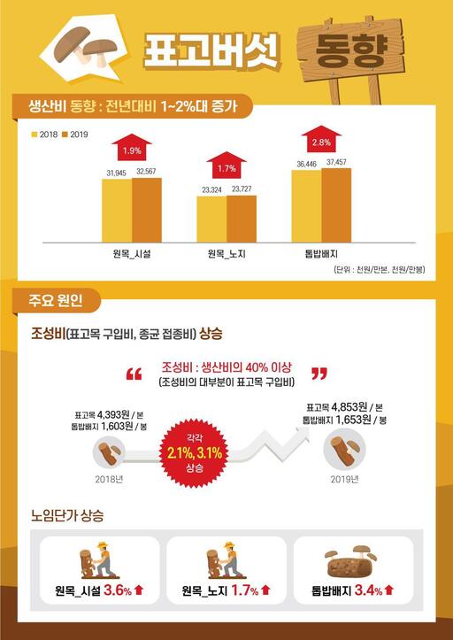 이는 위탁영농비, 임차료 등의 비용은 하락했지만, 노임 단가 상승으로 인해 노동비가 증가했기 때문으로 나타났다. 표고버섯의 경우 표고목과 톱밥배지 구입가격 상승으로 생산비가 증가했다.