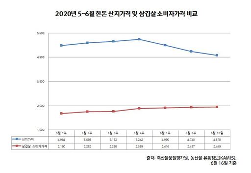 최근 정부 재난지원금 지급 이후 소비자가 선호하는 삼겹살에 대한 수요가 증가하자 산지가격은 지난 5월 말 소폭 상승했으나, 축산물품질평가원에 따르면 이후 지속적으로 떨어져 6월16일 기준 4578원/kg을 기록해 전월(5월 3주차 평균 5147원) 대비 11.05% 하락했다.