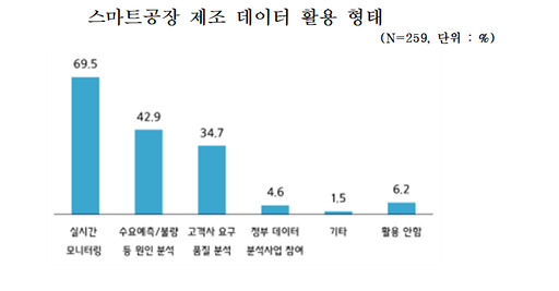 또한 제조 데이터는 ▲실시간 모니터링(69.5%) ▲수요예측·불량 등 원인분석(42.9%) ▲고객사가 요구하는 공정 품질 분석 자료(34.7%) 등에 활용되고 있다고 응답했다. 스마트공장 데이터가 단순히 쌓아두기만 하는 수준을 넘어 다양한 제조공정에 활용되고 있는 것이다.