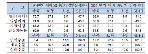 이런 가운데 지난해 상반기와 비교한 올해 상반기 경영실적에 대해선 10곳 중 7곳이 '악화'됐다고 응답(SBHI 기준 9.6포인트 하락)해 코로나로 인한 기업경영이 매우 부진한 것으로 나타났다.