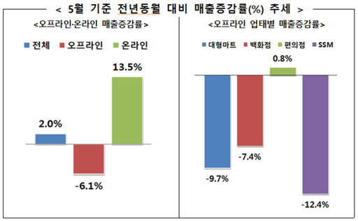 산업통상자원부는 백화점과 대형마트, 편의점 등 13개 오프라인 유통업체와 이베이코리아와 쿠팡 등 13개 온라인 유통업체의 올해 5월 매출을 조사한 결과, 오프라인 매출은 6.1% 감소했고, 온라인 매출은 13.5% 증가해 전년 동월 대비 전체 매출이 2.0% 증가했다고 29일 밝혔다.