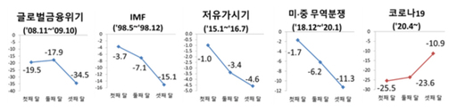 나 실장은 "코로나19 영향이 지속되고 있는 가운데서도 6월 수출증감률, 무역수지, 일평균 수출, 수출 물량 등 주요 지표들이 4~5월 대비 개선됐다"며 "향후에도 코로나19 영향이 지속될 수 있으나 현재 시점에서는 2008년 글로벌 금융위기, IMF, 저유가 위기 등과 다르게 셋째 달 실적이 개선되는 등 상대적으로 빠른 회복세를 보이고 있다"고 분석했다.