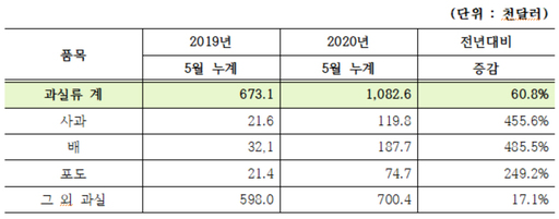 말레이시아로 수출되는 과실류는 5월 말 기준으로 전년 동기대비 60.8% 상승한 100만 달러이며, 특히 한국산 배는 전년 대비 5배, 사과는 4.5배, 포도는 2.5배 이상 늘어 어려운 여건 속에서도 한국산 과일의 말레이시아 전성시대를 맞고 있다.