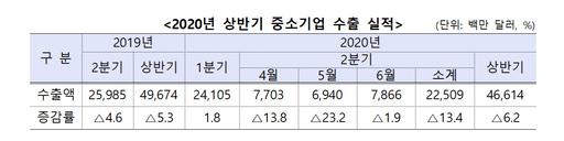 중소벤처기업부가 21일 발표한 '2020년도 상반기 중소기업 수출 동향' 자료에 따르면 상반기 중소기업 수출은 466억 달러를 기록하며 전년 동기에 비해 6.2% 줄었다.
