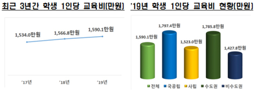 지난해 4년제 일반대학과 교육대학의 학생 1인당 교육비는 1590만1000원으로 전년 1566만8000원보다 23만3000원(1.5%) 증가했다. 학생 1인당 교육비에는 인건비, 운영비, 장학금, 도서구입비, 실험실습비, 기계기구매입비 등이 포함된다.