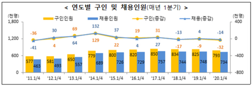 올해 1분기(1~3월) 5인 이상 사업체의 구인 인원은 79만3000명으로 전년 동기보다 3만2000명(3.9%) 감소했고 채용 인원은 73만4000명으로 1만4000명(1.9%) 줄었다.
