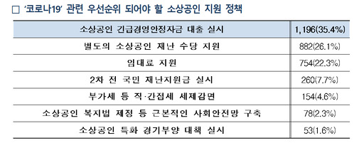 소상공인 관련 우선 순위 정책으로는 '긴급경영안정자금 대출'이 35.4%로 1위를 차지했다. 이외에 '별도의 재난 수당 지원'(26.1%), '임대료 지원'(22.3%) 등을 주로 꼽았다.