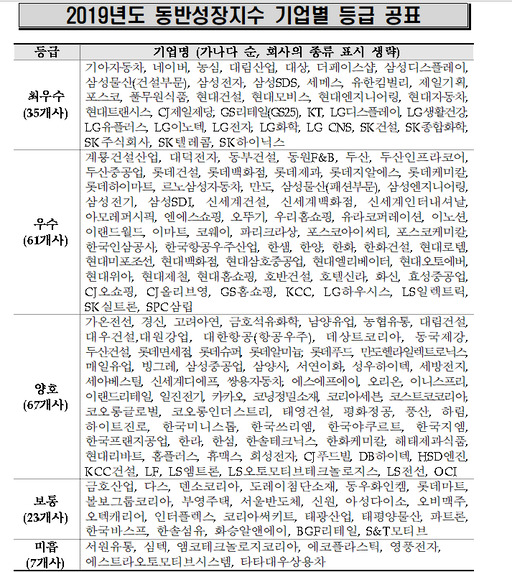 기아차, 삼성전자, 현대차, KT, LG전자, SK텔레콤 등 35개사가 지난해 동반성장지수 평가에서 '최우수'를 받았다.