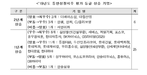 하지만 서원유통, 심텍, 앰코테크놀로지코리아, 에코플라스틱, 영풍전자, 에스트라오토모티브시스템, 타타대우상용차는 동반성장이 '미흡'했던 것으로 파악됐다.