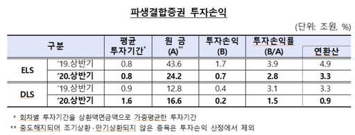 올해 상반기 ELS 투자수익률은 연평균 3.3%로 전년 동기 대비 1.6%포인트 낮아졌다. DLS 투자수익률도 지난해 같은 기간보다 2.4%포인트나 낮은 0.9%에 불과했다.