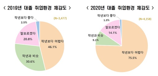 올해 대졸 신규 채용 환경이 지난해보다 어려워졌다고 답한 대학생은 75.5%로 작년 조사보다 29.4%포인트 늘었다.