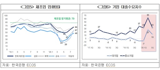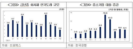 올해 내 만기가 도래하는 회사채 규모는 8.5조원에 이르고 있으며, 중소기업의 경우 그간의 금융지원에도 불구하고 대출 증가폭이 여전히 높은 수준을 유지하고 있다. 과거 3년(2017~2019년)간 중소기업 대출은 월평균 3조 5000억원씩 증가했으나, 올해 7월에는 6조4000억원, 8월에는 6조1000억원 만큼 큰 폭으로 증가했다. 이는 중소기업 자금사정의 어려움이 지속되고 있을 가능성을 시사하는 것이다.