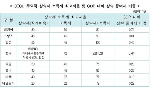 OECD 회원국의 소득세와 상속세 최고세율 합계에서도 우리나라는 일본(100%)에 이은 2위(92%)였고, 최대주주할증평가를 적용하면 102%로 OECD 회원국 중 1위로 나타났다. OECD 회원국 중 소득세와 상속세 부담이 가장 큰 것이다.