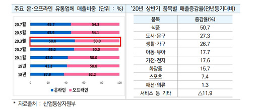 하지만 같은 기간 온라인은 16.9%(3월), 16.9%(4월), 13.5%(5월), 15.9%(6월), 13.4%(7월), 20.1%(8월)로 매달 고성장하고 있다. 특히 식품(50.7%), 도서·문구(27.3%), 생활·가구(26.7%)가 전년 동기에 비해 올해 상반기 많이 팔린 품목들이었다.