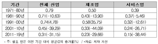 특히 서비스업의 산업역동성 하락이 제조업보다 훨씬 큰 것으로 나타났다. 최근 10년 평균 산업구조변화 속도 평균값을 비교했을 때 서비스업의 하락 폭은 마이너스(-)38.4%로 제조업(-29.6%)보다 컸다.