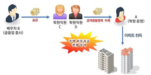 신고소득이 적은 A씨가 아파트를 다수 취득해 자금출처 부족혐의로 조사한 결과, 탈세 혐의가 포착됐다. 금융업에 종사하는 배우자 B가 A의 부동산 취득자금을 학원 직원 수 명의 계좌로 입금하고 학원 직원은 이를 과다 급여 반환 명목으로 A에게 송금한 후 해당 자금으로 다수의 아파트를 취득한 사실을 확인했다.