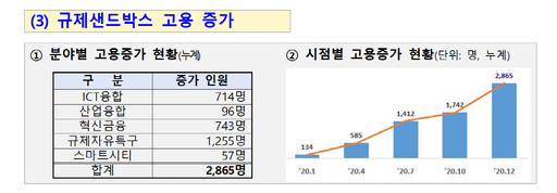 고용도 규제자유특구에서만 1255명이 증가하는 등 규제샌드박스를 통해 총 2865명의 일자리가 새로 생겼다.