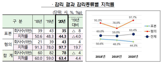 표본 심사·감리 지적률은 44.3%로 전년 대비 4%포인트 하락한 반면 혐의 심사·감리 지적률은 97.7%로 전년 대비 19.7%포인트 상승했다.