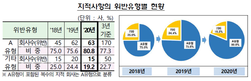 금감원 관계자는 "2019년에는 연결재무제표 작성범위와 관련한 조치양정기준 완화 등으로 무혐의로 종결한 회사가 크게 늘었지만 작년에는 선정기업 대부분을 조치해 지적률이 높아졌다"고 설명했다. 위반유형별로는 당기손익 또는 자기자본의 변동을 초래하는 중요한 위반 사례가 63개사로 전체의 80.8%를 차지했다. 매출·매출원가 과대계상 및 유동·비유동 분류 오류 등 중요한 재무정보 관련 위반은 15개사다.