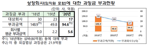 지난해 상장사에 대한 심사·감리 결과 과징금 부과 규모가 급증한 것으로 나타났다. 고의 위반사례가 늘어난데다 외감법 상 과징금 신규 부과도 영향을 미쳤다.