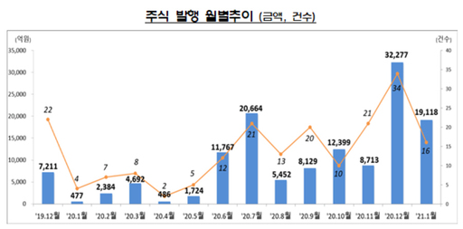 금감원 관계자는 "주식은 계절적 요인과 전월 대규모 유상증자 집중에 따른 기저효과 등으로 발행이 줄었다"고 설명했다.