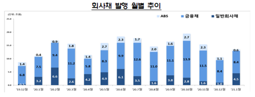 금감원 관계자는 "저금리 등으로 기업의 발행수요가 증가하는 가운데 기관투자자의 자금집행이 재개되면서 우량 일반회사채를 중심으로 발행이 확대됐다"고 설명했다.