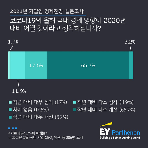 4일 EY한영의 전략 특화 컨설팅 조직 EY-파르테논은 이 같은 내용을 담은 '2021년 경제 전망 설문조사' 결과를 발표했다. EY-파르테논은 지난달 기업 CEO와 임원들을 초청해 개최한 'EY한영 신년 경제전망 세미나' 참석자 총286명을 대상으로 설문조사를 실시했다.