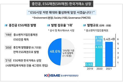 중진공 관계자는 "코로나19 팬데믹 극복과 포스트 코로나 대응을 위해 사회책임투자의 중요성이 어느때보다 부각되고 있고, 금융시장 내에서도 ESG채권에 대한 투자수요가 급증하고 있어 상장을 하게 됐다"고 설명했다.