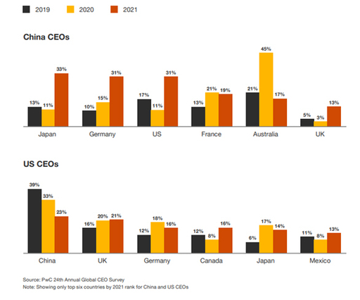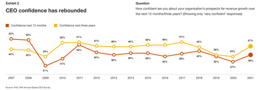 밥 모리츠(Bob Moritz) PwC 글로벌 회장은 조사 결과에 대해 "지난해 코로나19로 인한 인류의 비극과 경제적 어려움에도 불구하고, 기업을 운영하는 CEO들이 경제 성장을 긍정적으로 전망하는 것은 매우 고무적"이라며 "백신의 빠른 개발 및 보급에 따른 집단 면역 달성으로 글로벌 경제 성장을 기대하는 이들이 늘었다"고 분석했다.